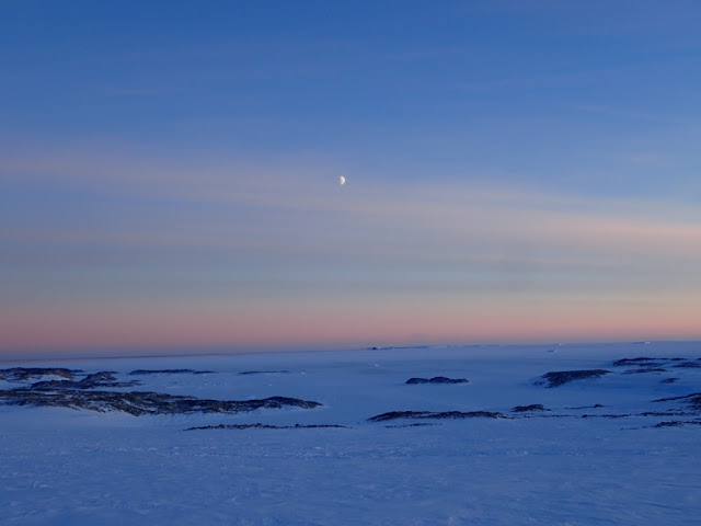 We were all set by about 1115hrs ish and piled back into the Hagg to return to station. as we drove along the W-line I spied the sun finally peeking over the horizon. On a clear morning like this with no low horizon cloud we actually can see the sun as it slides along the horizon.  The last week or so has given us endless beautiful pastel skies for the few hours of light that we have.